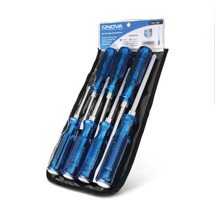 شرکت Nova محصولات مختلفی را در خصوص ستهای پیچگوشتی تولید کرده است. ست 7 پارچه مدل NTS 2160 یکی از این محصولات است. این ست پیچگوشتی دارای دسته پلاستیکی شفاف آبیرنگ ساخته و شامل 3 عدد پیچگوشتی با سری دو سو و 4 عدد پیچگوشتی با سری چهارسو شده است. میله این پیچگوشتیها از جنس کروم وانادیوم، سختکاری شده و به شکل ششگوش ساختهشده که امکان گرفتن میله آن را با آچار فراهم کرده است. تمام دستههای این پیچگوشتیها از کریستال مقاوم در برابر ضربه ساختهشده و قابلیت کوبش پذیری (چکش خور) را هم دارد. این ست، با یکی کیف برزنتی در اختیار شما قرار خواهد گرفت و برای کارهای مختلف خانگی. صنعتی بسیار مناسب است. تعداد و تنوع ابزارهایی که در منزل یا خودرو استفاده میکنیم غالبا محدود است و بیشتر آنها ابزارهای دستی و بدون نیاز به برق و باتری است. شاید شما ترجیح دهید که با هزینهای کم این ابزارها را در اختیار داشته باشید. پیچگوشتی ازجمله ابزارهایی است که در همه خانهها و خودروها وجود دارد و یا حتی در بسیاری از مشاغل این ابزار در جعبه یا میز کار دیده میشود. اگر بخواهید این ابزار را با تعداد محدود، اما برای کاربردهای مختلف در منزل، خودرو یا حتی محل کارتان در اختیار داشته باشید، باید یک ست پیچگوشتی تهیه کنید. ست پیچگوشتی در تعداد و ابعاد مختلف در بازار یافت میشود. کوچک یا بزرگ، پلاستیکی یا فلزی، معمولی یا چکش خور مواردی است که راه انتخاب خرید شما را مشخص میکند.