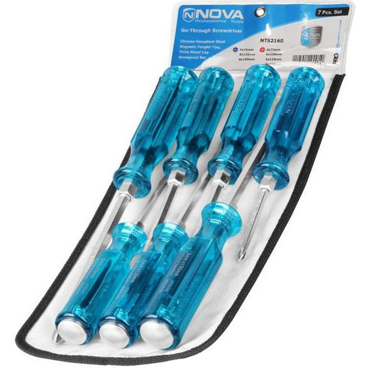 شرکت Nova محصولات مختلفی را در خصوص ستهای پیچگوشتی تولید کرده است. ست 7 پارچه مدل NTS 2160 یکی از این محصولات است. این ست پیچگوشتی دارای دسته پلاستیکی شفاف آبیرنگ ساخته و شامل 3 عدد پیچگوشتی با سری دو سو و 4 عدد پیچگوشتی با سری چهارسو شده است. میله این پیچگوشتیها از جنس کروم وانادیوم، سختکاری شده و به شکل ششگوش ساختهشده که امکان گرفتن میله آن را با آچار فراهم کرده است. تمام دستههای این پیچگوشتیها از کریستال مقاوم در برابر ضربه ساختهشده و قابلیت کوبش پذیری (چکش خور) را هم دارد. این ست، با یکی کیف برزنتی در اختیار شما قرار خواهد گرفت و برای کارهای مختلف خانگی. صنعتی بسیار مناسب است. تعداد و تنوع ابزارهایی که در منزل یا خودرو استفاده میکنیم غالبا محدود است و بیشتر آنها ابزارهای دستی و بدون نیاز به برق و باتری است. شاید شما ترجیح دهید که با هزینهای کم این ابزارها را در اختیار داشته باشید. پیچگوشتی ازجمله ابزارهایی است که در همه خانهها و خودروها وجود دارد و یا حتی در بسیاری از مشاغل این ابزار در جعبه یا میز کار دیده میشود. اگر بخواهید این ابزار را با تعداد محدود، اما برای کاربردهای مختلف در منزل، خودرو یا حتی محل کارتان در اختیار داشته باشید، باید یک ست پیچگوشتی تهیه کنید. ست پیچگوشتی در تعداد و ابعاد مختلف در بازار یافت میشود. کوچک یا بزرگ، پلاستیکی یا فلزی، معمولی یا چکش خور مواردی است که راه انتخاب خرید شما را مشخص میکند.