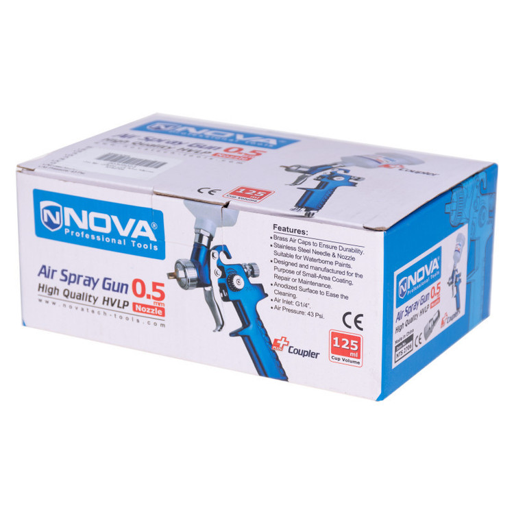 پیستوله یکی از ابزارهای بادی کاربردی در هنگام رنگ کاری است.پیستوله رنگ پاش نووا مدل 2706 یک پیستوله رنگ کاسه رو با سیستم HVLP است که دارای یک کاسه پلاستیکی 125 میلی لیتری است.کلاهک برنجی هوای این دستگاه باعث دوام بیشتر می شود و سوزن و نازل از جنس فولاد زنگ نزن آن را برای پاشش رنگ های پایه آب مناسب نموده است. سایز نازل این دستگاه برابر با 0.5 میلی متر است.این پیستوله رنگ پاش نووا که برای رنگ کاری های ظریف طراحی و ساخته شده است، مجهز به سه عدد تنظیم است. یک پیچ برای تنظیم میزان خروجی رنگ، یک پیچ برای تنظیم پهنای رنگ و پیچ سوم برای تنظیم میزان ورودی باد به پیستوله به کار می رود. سایز ورودی هوای این پیستوله نووا به صورت "G1/4 است. دستهی فلزی ارگونومیک این پیستوله باعث راحتی کار شما می شود و سطح آنودایز شده آن پس از اتمام کار شما، تمیزکاری آسانی به دنبال خواهد داشت.فشار باد کارکردی این پیستوله کاسه رو نووا برابر با 43PSI است و در بسته بندی آن کوپلینگ، آچار و برس قرار داده شده است.