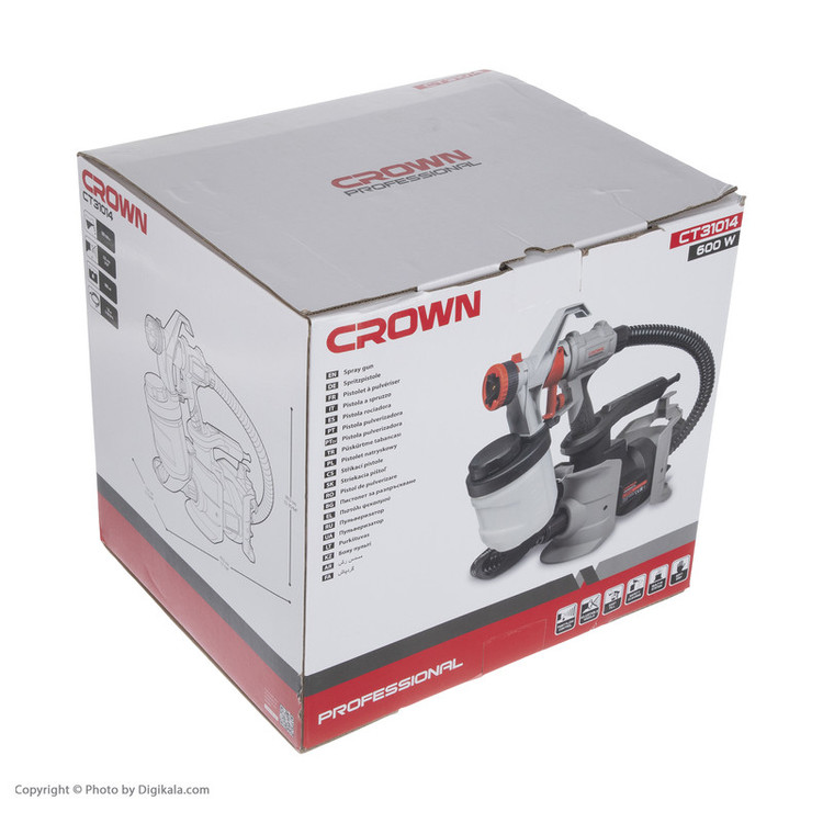 پیستوله برقی کرون مدل CT31014، ساخته شده در شرکت کرون (Crown) است. این محصول تحت عنوان مدل (CT31014) به بازار عرضهشده است. این پیستوله دارای 2845 گرم وزن است. یکی از ویژگیهای بسیار خوب این پیسوله این است که در زمان اتمام کار میتوان آن را از سمت دسته داخل استند خود قرار دهیم. شرکت کرون برای این پیستوله یک نازل برنجی با قطر 2.5 میلیمتر در نظر گرفته است. برنج یکی از فلزاتی است که در برابر اثر خوردگی توسط مواد شیمیایی دارای مقاومت بسیار بالایی است. پیستولهها به دو صورت بادی و برقی ساختهشدهاند. مشکل پیستولههای بادی این است که نیاز به یک کمپرسور باد برای پخش رنگ از نازل هستند ولی پیستوله برقی چنین مشکلی را ندارد و با یک مخزن کوچک یا بزرگ که به آن وصل میشود، پاشش رنگ روی سطح صورت میگیرد. کار نقاشی با پیستولههای برقی بسیار راحت است و نیاز به مهارت چندانی ندارد و تنها با حرکت یکنواخت میتوانید سطوح یا جسم مدنظرتان را نقاشی کنید. موتور این دستگاه با توان ۶۰۰ وات، قادر است به خوبی نیاز شما برای رنگآمیزی برطرف کند. مخزن رنگ این پیستوله بهراحتی از دستگاه جدا میشود و تا 900 میلیلیتر گنجایش انواع رنگ را دارد. مزیت که سری پیستوله برقی کرون مدل CT31014 نسبت به نسل قبلی و رقبای خود در بازار این محصول دارد قابلیت شارژ مجدد مخزن بدون جدا سازی از بدنه و با دریچهای است که به این منظور روی آن تعبیه گردیده است. برای کسانی که میخواهند کارهای نقاشی خود را بهراحتی در منزل انجام دهند و یا کسانی که زیاد بارنگ و مشتقات آن سروکار دارند خرید این پیستوله را پیشنهاد میکنیم.