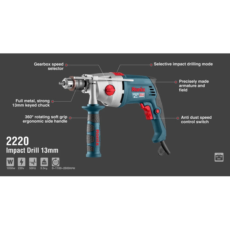 دریل چکشی مدل 2220 شرکت رونیکس است که علاوه بر قدرت مناسب در حالت چکشی، بهصورت معمولی نیز میتوان از آن استفاده کرد. این مدل با ابعاد 22 × 7 × 34 سانتیمتر و وزن 3.7 کیلوگرمی تولیدشده است. دارای قابلیت کنترل سرعت و با دو حالت در سرعت گردش به میزان 0-1100 یا 0-2800 دور بر دقیقه گردش میکند که جهت این گردش با انتخاب شما بهصورت چپگرد یا راستگرد خواهد شد. این دریل با برق 230 ولت و قدرت 1050 وات برای کارهای صنعتی نیز مناسب است. حداکثر قابلیت سوراخ در مصالح، چوب و فلز به ترتیب 16، 30 و 13 میلیمتر است طراحی ارگونومیک، یک دسته کمکی باقابلیت گردش 360 درجه و کابل برق 3 متری کمک بیشتری برای سهولت کار و انتخابی مناسب برای خرید شما است. اگر تابهحال از دریل استفاده کرده باشید و خواسته باشید دیوار، سقف و یا جسمی از مواد بتنی را سوراخ کنید، حتما از متههای الماسه استفاده کردهاید. این متهها از جنسی مقاوم و مخصوص سوراخکاری چنین مواردی ساخته شدهاند. اما گاهی سختی و مقاومت مصالح بهاندازهای است که مجبورید به استفاده از دریلی هستید که دارای حالت چکشی یا ضربهای نیز باشد. این قابلیت باعث میشود که مته ضمن چرخش به مواد و مصالح موردنظر ضربههای با سرعت و تعداد بالا وارد کند تا سوراخکاری بهتر و سریعتر انجام شود و شما علیرغم احساس لرزش ناخوشایند هنگام کار با دریل، سرعت عمل بهتری داشته باشید. دریلهایی که حالت چکشی را دارند بسیار زیاد، متنوع و در ابعاد مختلفی هستند. طبیعتا تهیه دریلی که هم برای حالت عادی و هم برای کار در حالت چکشی بتوان از آن استفاده کرد، مقرون بهصرفهتر است.