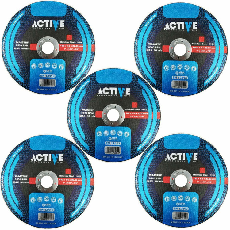حاوی 5 عدد صفحه برش استیل اکتیو اصلی با قطر 180(فرز بزرگ) و ضخامت 1.6 میلیمتر . مناسب برای برش انواع فلزات آهن ، استیل و... با فرز بزرگ با دور 8500 دور در دقیقه. دارای استاندارد EN12413 . حتما قبل ازشروع استفاده نکات ایمنی مورد نیاز کار با فرز را رعایت کنید.-(دقت بفرمایید مناسب مینی فرز نیست)