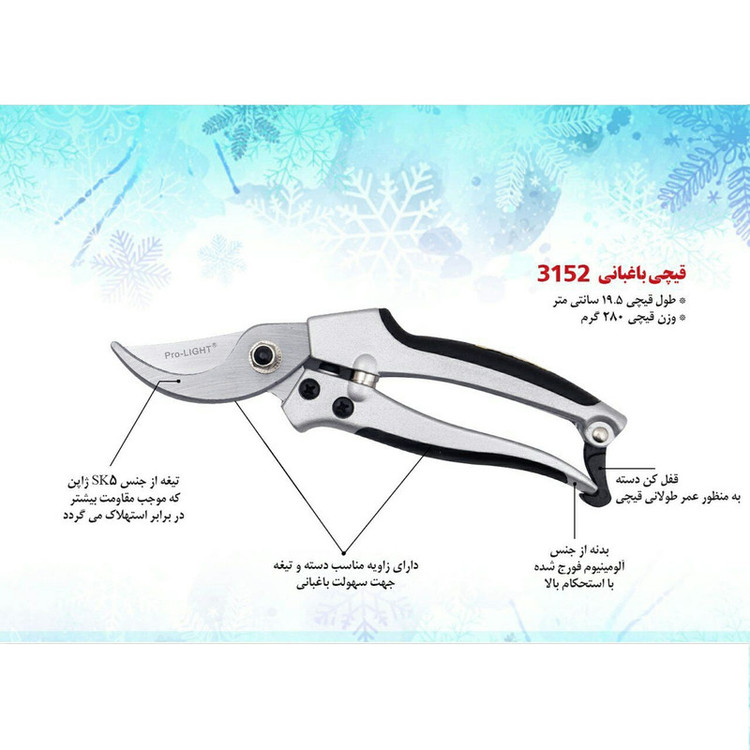 قیچی باغبانی لایت مدل 3152 مجهز به تیغه های فولادی SK5 ژاپن است. از ویژگی های این قیچی باغبانی میتوان به بدنه از جنس آلومینیوم فورج شده با استحکام بالا، دارای زاویه مناسب دسته و تیغه جهت سهولت باغبانی و همچنین قفل کن دسته را نام برد. لازم به ذکر است طول قیچی 19.5 سانتی متر و وزن تقریبی این قیچی 280 گرم بیان شده است.