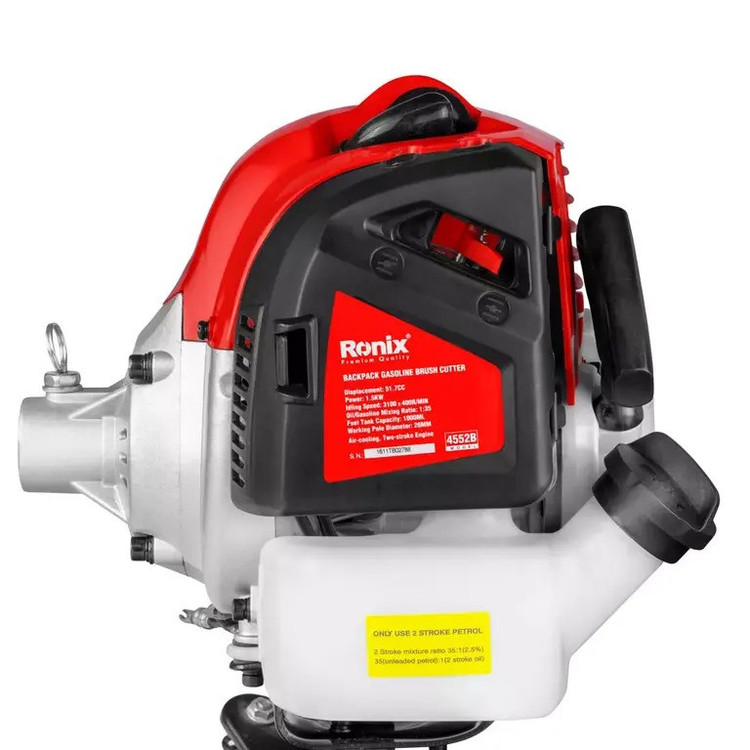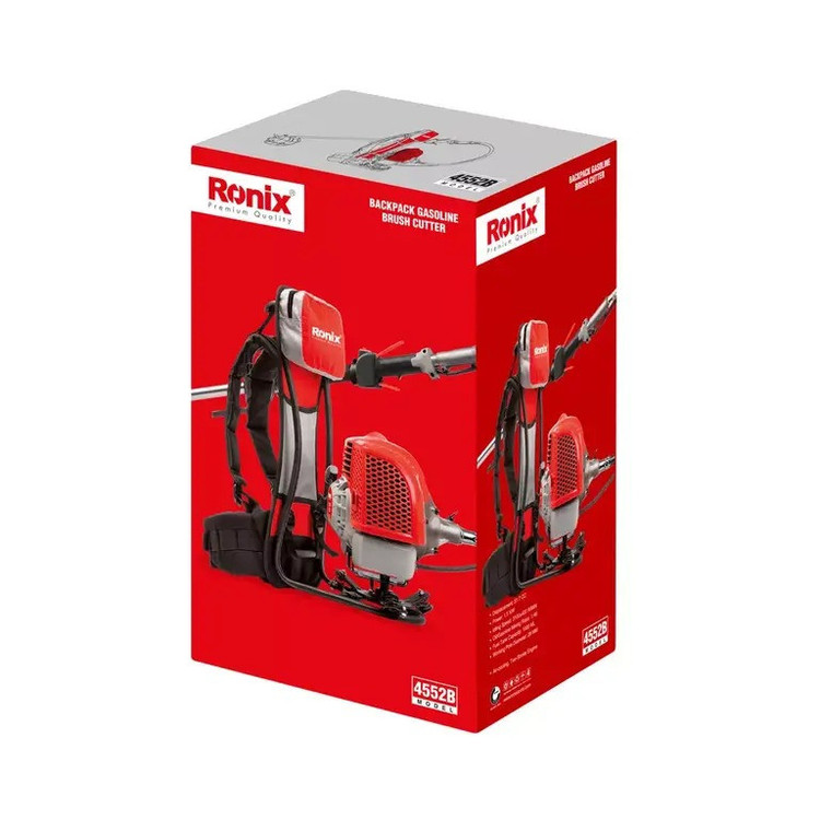 حاشیهزن موتوری 4552B یکی از ابزارآلات باغبانی متنوع رونیکس است که میتوان از آن جهت چیدن و برش علف، چمن و ... استفاده کرد. این ابزار مجهز به موتور بنزینی قدرتمند و دوزمانه با توان 1500 وات و ظرفیت 51.7 سیسی است که میتواند با سرعتی بالغ بر 3100 دور در دقیقه دستگاه را به گردش درآورد. از ویژگیهای منحصربهفرد این دستگاه طراحی ارگونومیک آن است که با برخورداری از کولهپشتی با بند شانهای قابل تنظیم میتواند به راحتی بر روی شانههای کاربر قرار گیرد.این دستگاه دارای مخزن 1000 میلیلیتری؛ نوع سوخت مصرفی دستگاه بنزین بوده و نسبت ترکیب سوخت روغن به بنزین برابر با 1 به 35 است. دارای تیغه فلزی سهپره دلتا و تیغه نخ نایلونی برای انجام کارهای سنگین؛ قطر تیغه فلزی شاخهزن: 255 میلیمتر و قطر تیغه نخ نایلونی چمنزن: 430 میلیمتر؛ دستگاه برای هدایت ذرات برشخورده، همراه با محافظ تیغه با طراحی رونیکس ارائه میشود.این علف زن دارای طراحی سبک و ارگونومیک؛ مجهز به دسته جانبی ارگونومیک تمامآلومینیومی با روکش لاستیکی به منظور سهولت کاربری؛ دارای لوله به قطر 26 میلیمتر که انتقال قدرت از بدنه به تیغهها را بر عهده دارد. همچنین، استفاده از سیستم ضد لرزش در دستگاه موجب سهولت کاربرد و کاهش خستگی دست کاربر میشود.